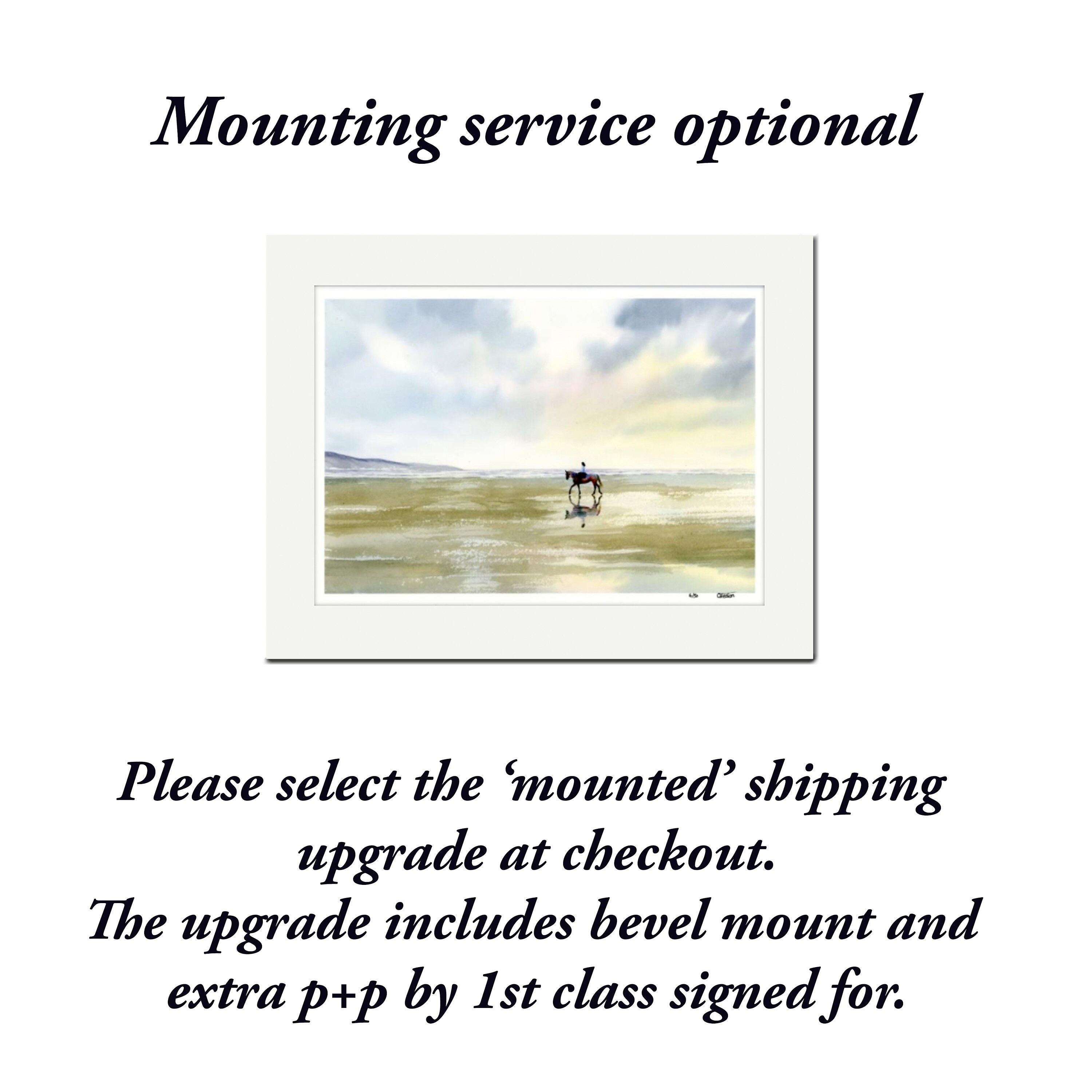 The print is supplied unmounted and unframed however a mounting service is available (UK only) as an upgrade at checkout for £8:00. The price includes mounting in a soft white bevel cut mount (that will fit a standard 14" x 11" frame), backing board, clear presentation cello bag, extra packaging and postage by 1st class signed for service.